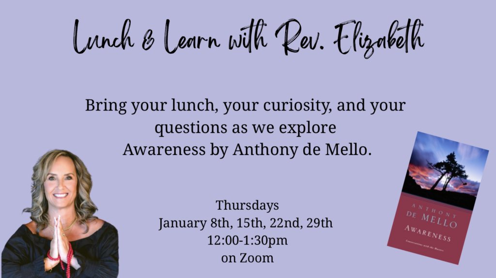 January’s Book of the Month is Awareness by Anthony de Mello, and this four-week Lunch & Learn offers a deeper dive than what will be shared in Sunday services.