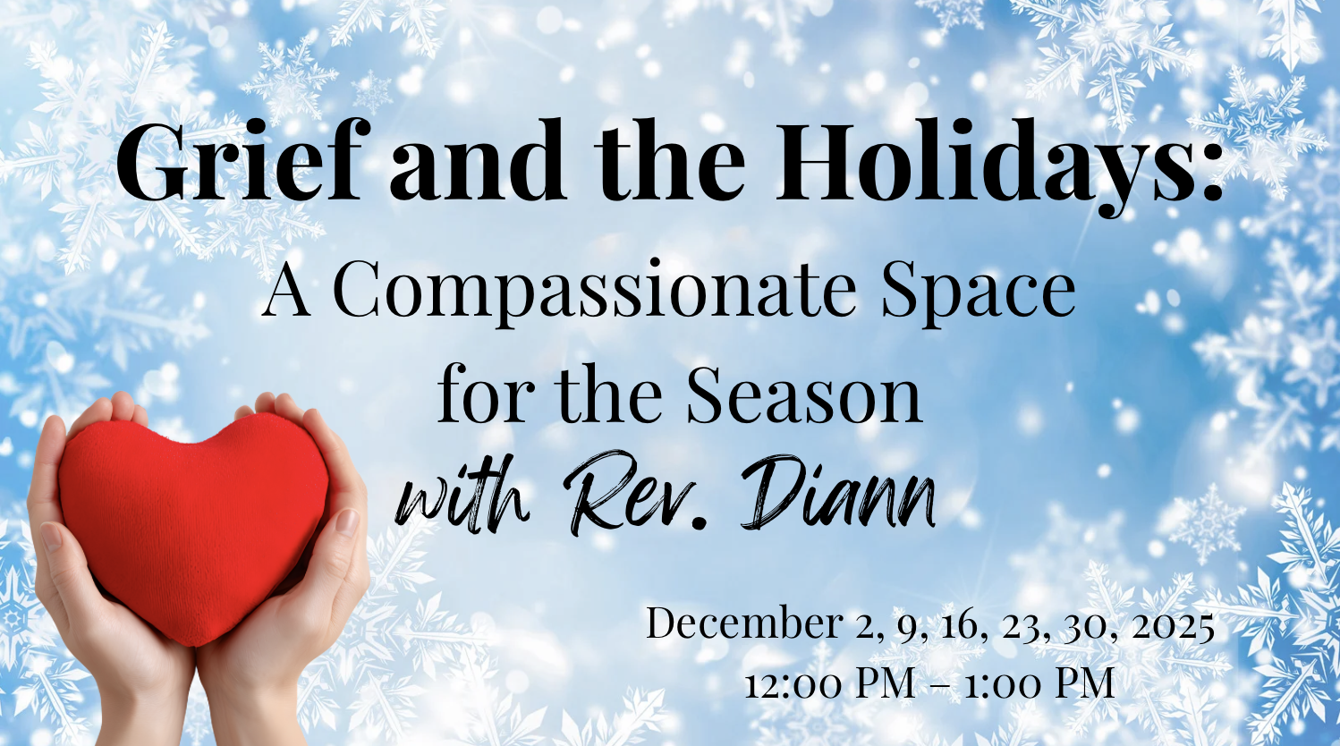 Grief and the Holidays: A Compassionate Space for the Season is A Weekly Drop-In Gathering with Rev. Diann Davisson The holiday season can bring tender memories, deep emotions, and unexpected...