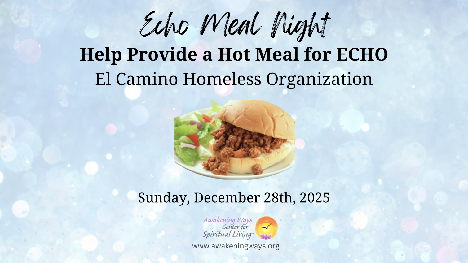 On Sunday, December 28th at 4:30pm, Awakening Ways CSL will be providing a hot meal for ECHO (El Camino Homeless Organization), and we need your help to make it happen!...