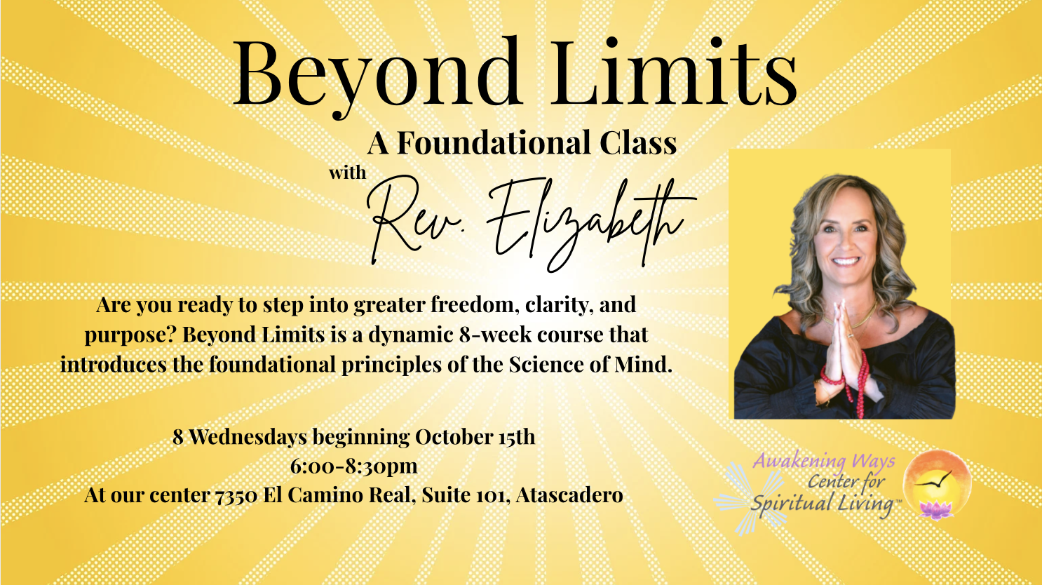Are you ready to step into greater freedom, clarity, and purpose?  Join Rev. Elizabeth for Beyond Limits, a transformative 8-week course that introduces the foundational principles of the Science of Mind. Beyond Limits is a dynamic and innovative course designed to introduce new students, and individuals unfamiliar with the Science of Mind, to its foundational principles. Through...