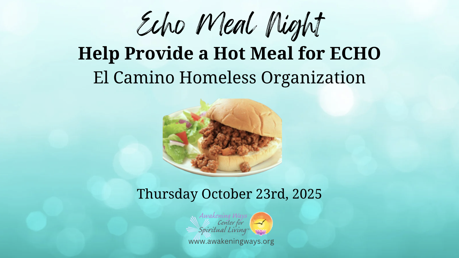On Thursday, October 23rd, Awakening Ways CSL will be providing a hot meal for ECHO (El Camino Homeless Organization), and we need your help to make it happen! We are serving beef and lentil sloppy Joes, green salad and cookies. If you would love to prepare and/or serve the meal, email us at events@awakeningways.org to...