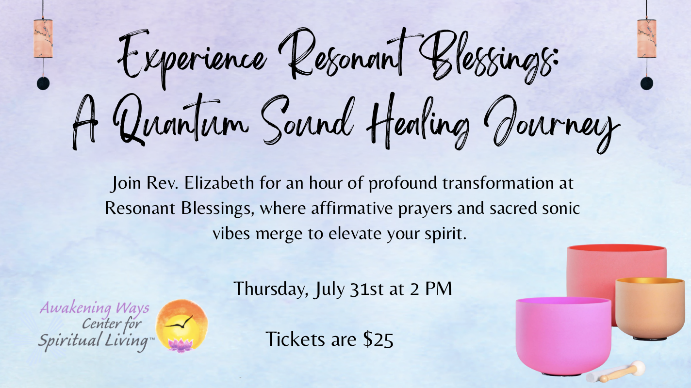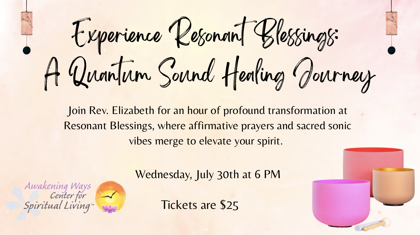 Join Rev. Elizabeth for an hour of profound transformation at Resonant Blessings, where affirmative prayers and sacred sonic vibes merge to elevate your spirit. Immerse yourself in the healing frequencies of sound, guided by uplifting words of affirmation that resonate at a quantum level. This immersive ceremony will harmonize your energy, awaken inner peace, and align...