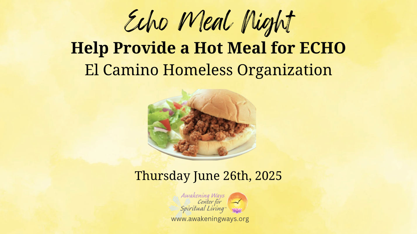 On Thursday, June 26th, Awakening Ways CSL will be providing a hot meal for ECHO (El Camino Homeless Organization), and we need your help to make it happen!We are serving beef and lentil sloppy Joes, green salad and cookies. If you would love to prepare and/or serve the meal, email us at events@awakeningways.org to get...