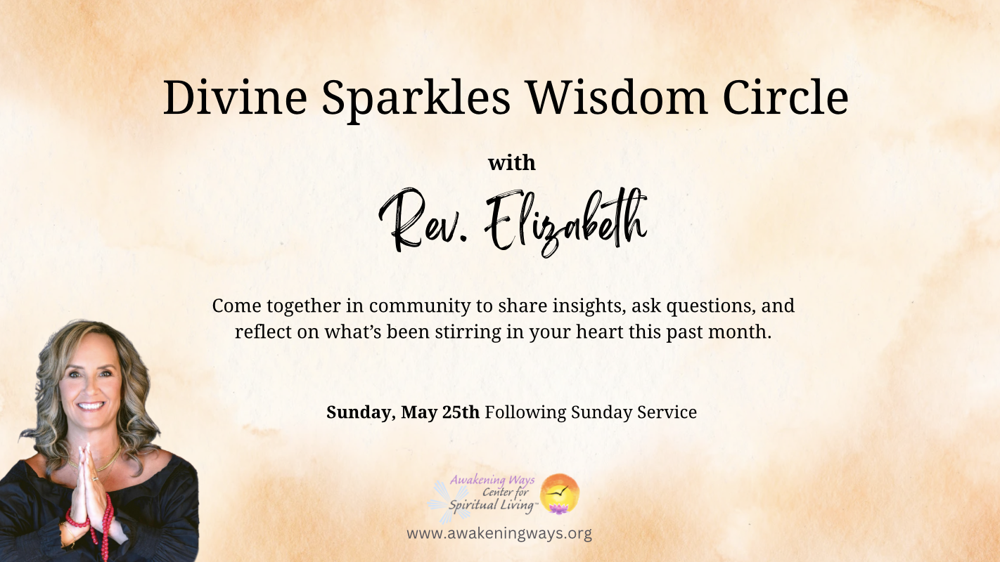 Divine Sparkles Wisdom Circle with Rev. Elizabeth Join us for a heartfelt and open gathering where community members are invited to share insights, reflections, and inspirations from the past month. Whether it’s a question that’s been stirring within you, a moment of clarity, or wisdom you’ve gained, this is a safe and welcoming space to...
