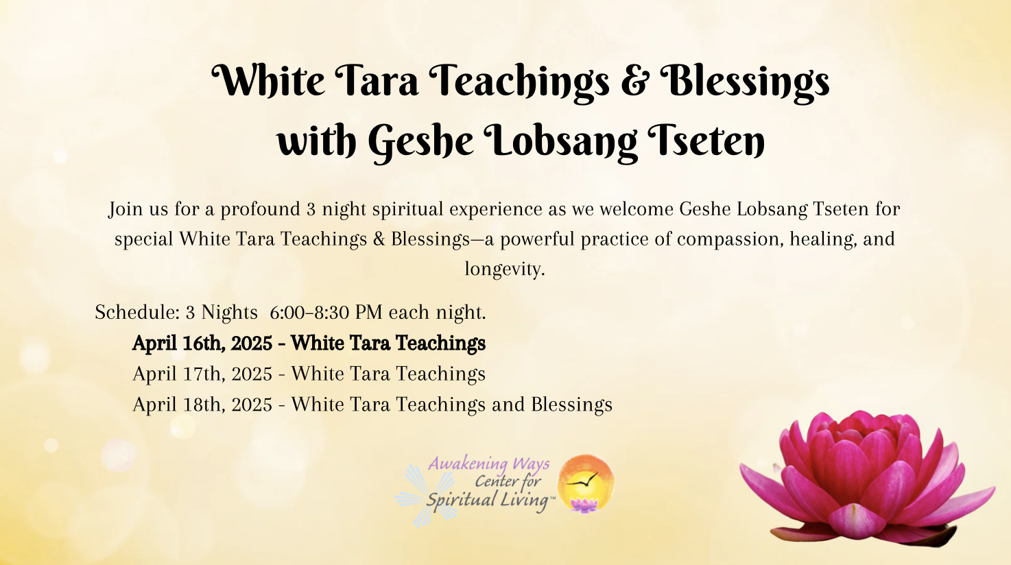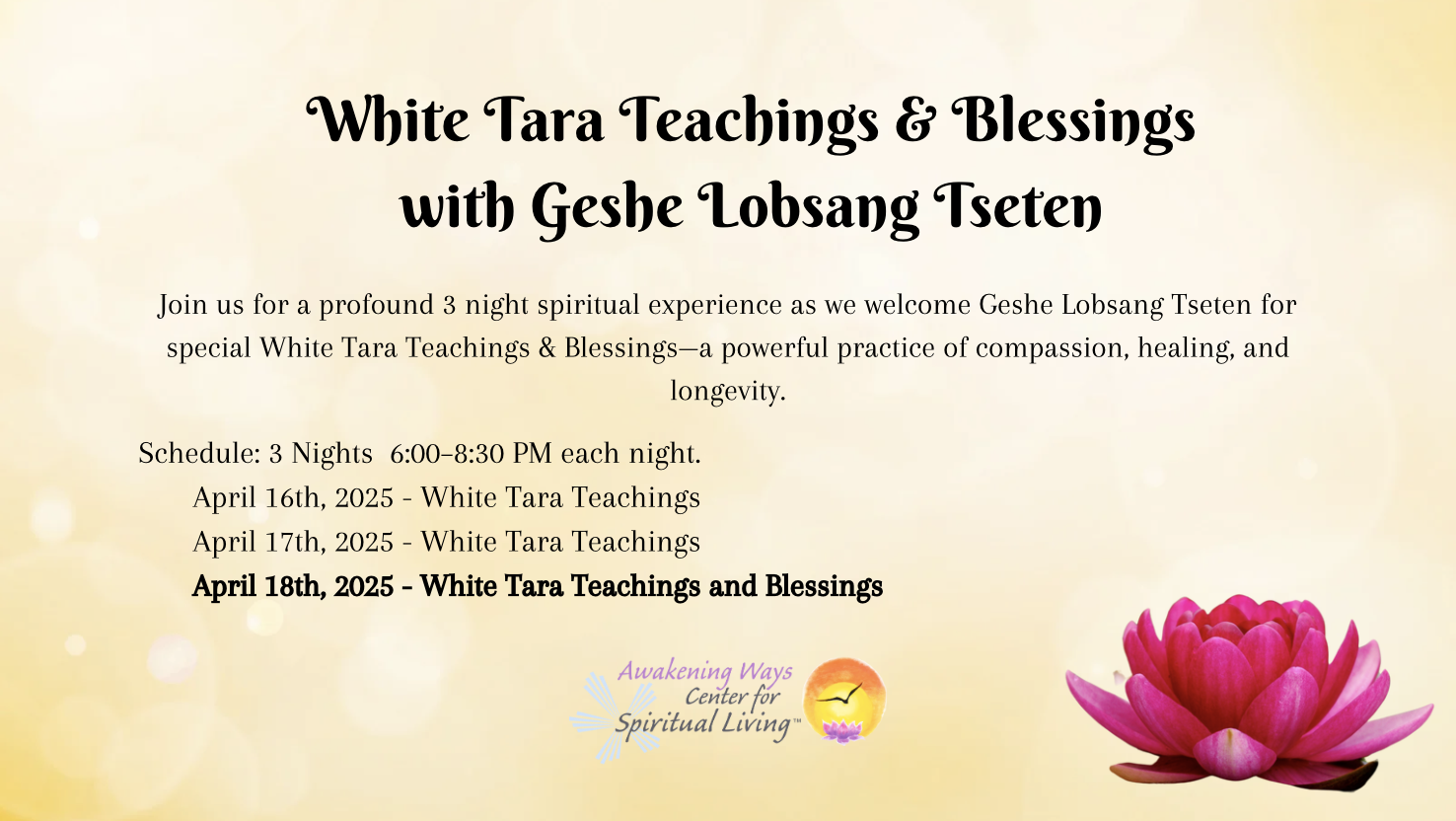Awakening Ways is honored to welcome back Geshe Lobsang Tseten, a highly respected Tibetan Buddhist teacher and scholar, for three special evenings of teachings on White Tara. Schedule: 3 Nights  6:00–8:30 PM each night.Wednesday, April 16 & Thursday, April 17: Teachings on White Tara Friday, April 18: Teaching & White Tara Blessings White Tara is a revered Buddhist deity associated...
