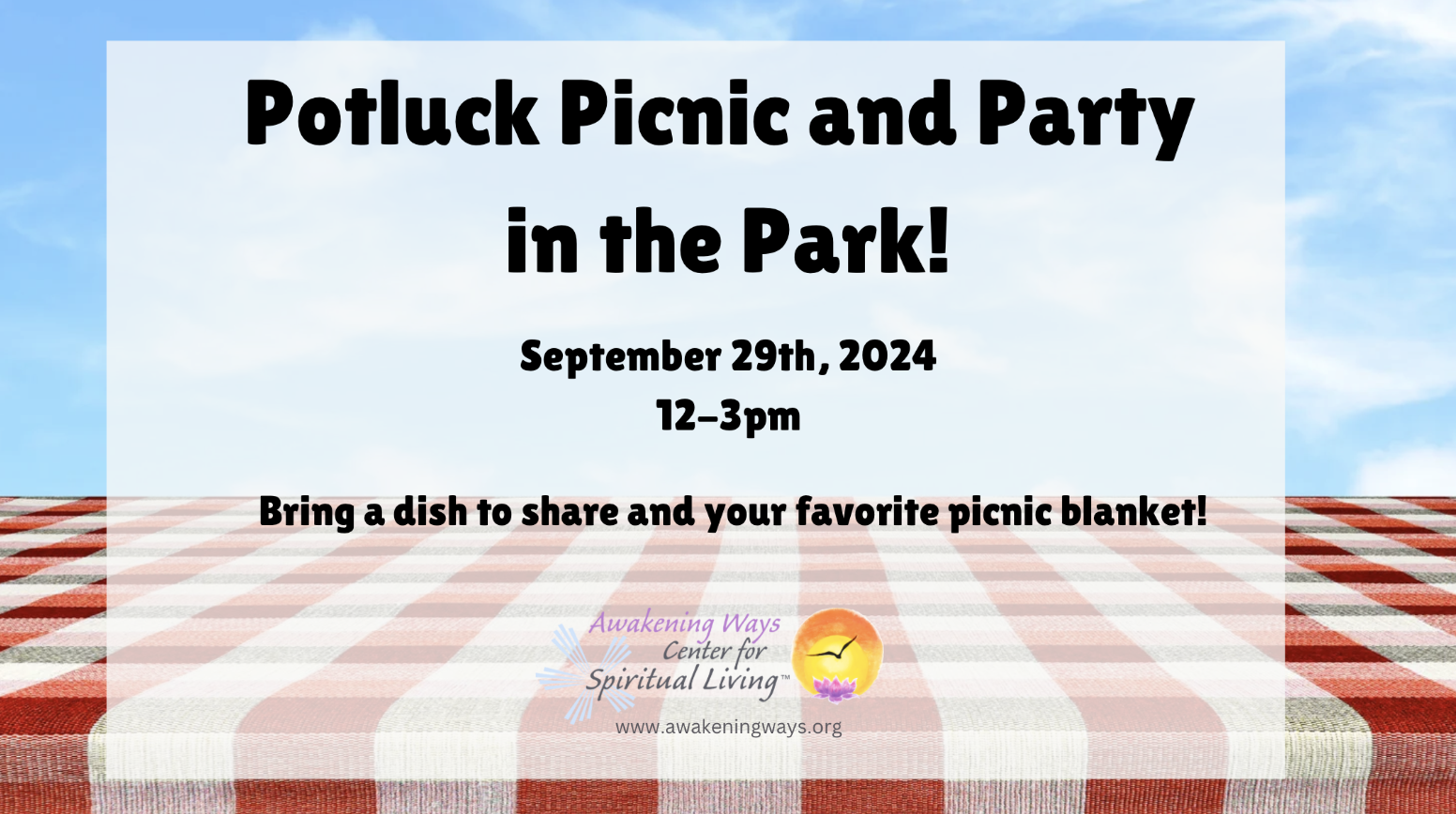 Join us on Sunday, September 29, 2024, after our gathering for a potluck picnic and party in the park. Enjoy an afternoon filled with food, fun, and great company! Jimmy and the What Else is Possible Band will lead us in acoustic sing-alongs, and we'll also have a playlist ready to keep the good vibes...