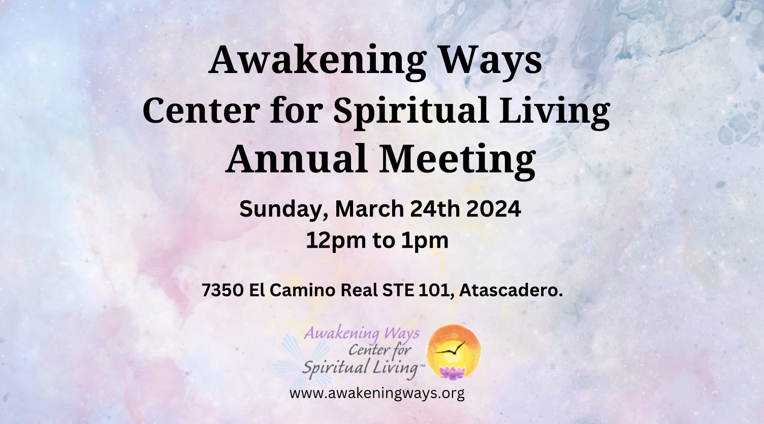 Join us Sunday, 3/24/24, for the Awakening Ways Center for Spiritual Living Annual Meeting. When: Sunday, March 24th 2024 from 12:pm - 1:00pm Where: Our office at 7350 El Camino Real STE 101, Atascadero. Light lunch will be served.