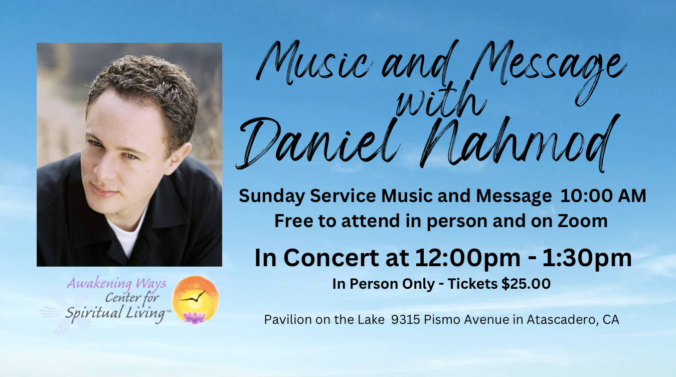 The Atascadero Pavilion on the Lake 9315 Pismo Ave., Atascadero, CAJoin us Sunday February 18th, 2024 for Music, Message and a Concert with Daniel Nahmod! Sunday service is at 10:00 am in person and on Zoom. All are welcome and it is free to attend. Concert is 12:00-1:30pm. Tickets for the concert are $25.00 (kids 18 and under free). No one will be turned away...